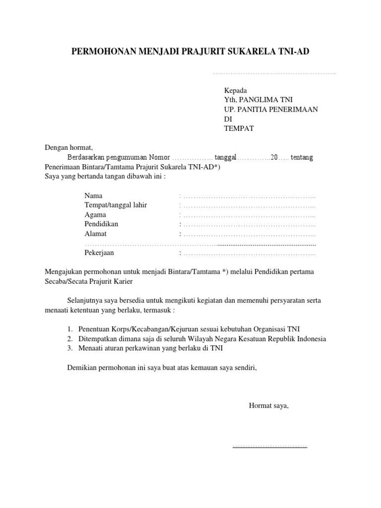 Donwload fille surat lamaran prajurit tni ad tamtama.